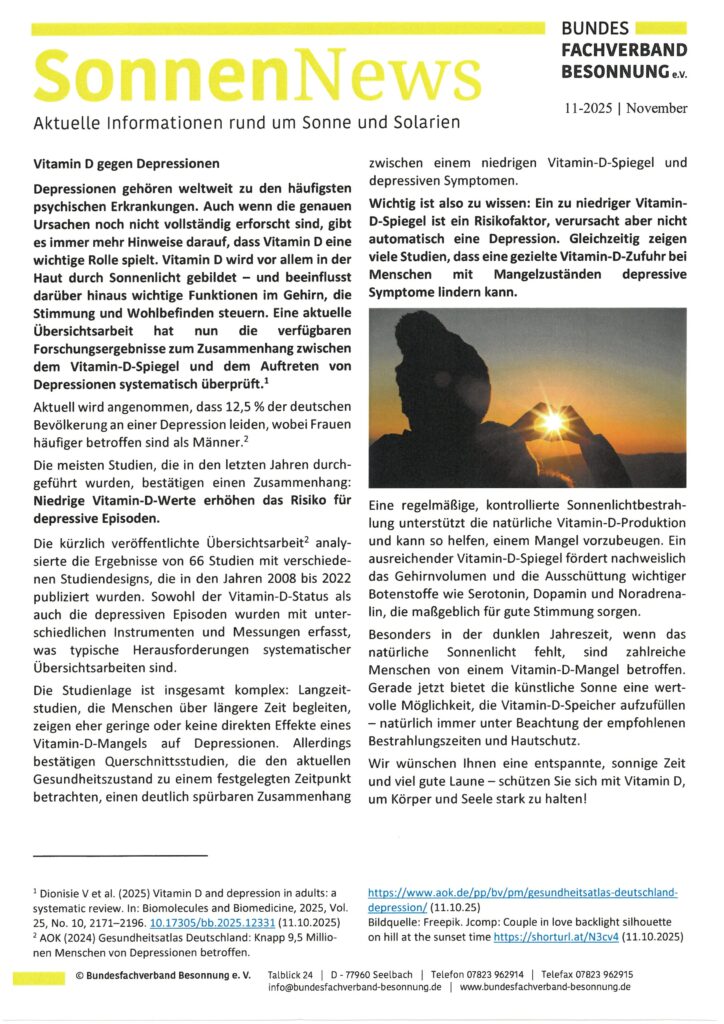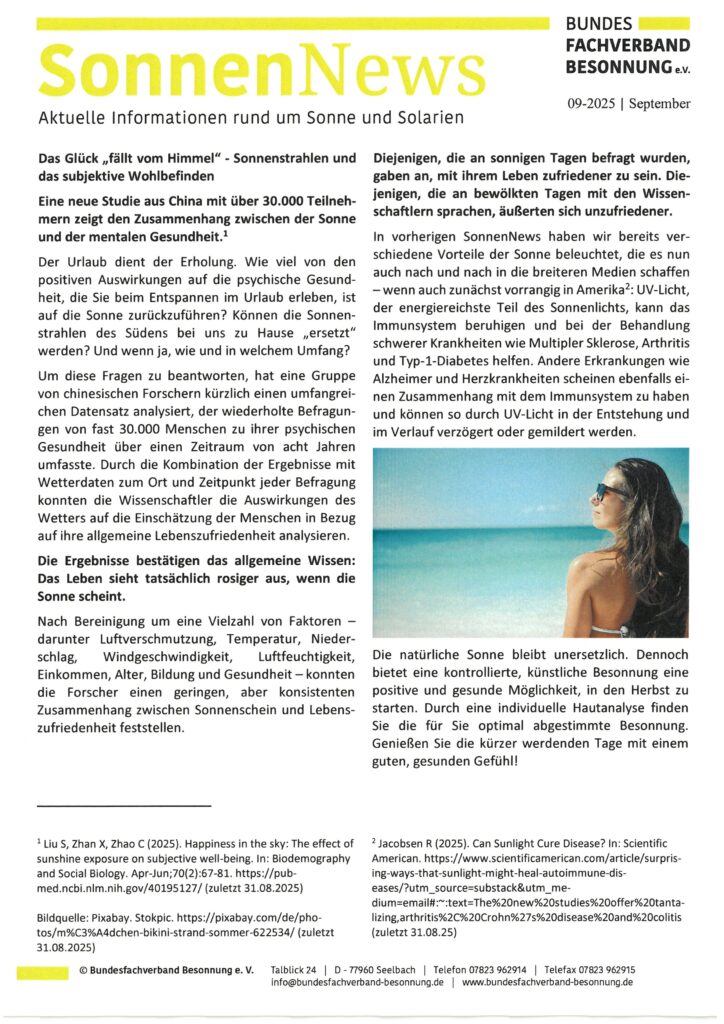 Hinweiskarte mit der Aufschrift 'Frisch desinfiziert' auf einem Solarium, mit einem Bild einer Frau, die am Strand liegt. Die Karte erinnert an Schutzbrille und Solarkosmetik.